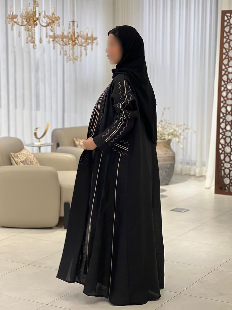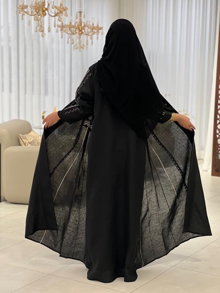 تمتاز العباية بتطريزات مستوحاة من الهوية العسيرية الأصيلة، لكنها مُنفّذة بأسلوب عصري راقٍ يبرز جمال التفاصيل ويمنحك حضوراً أنثوياً أنيقاً في كل مناسبة.