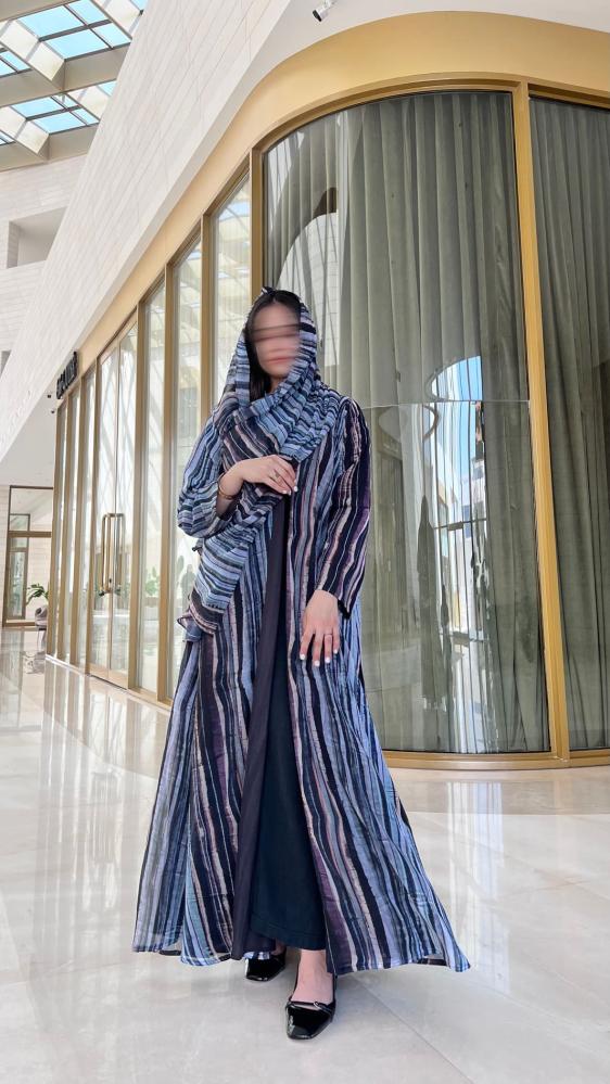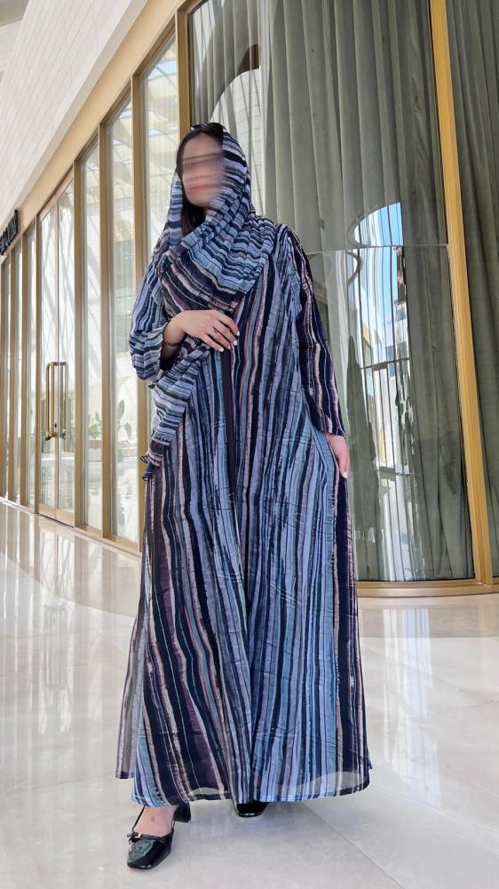 عباية راقية بقماش شيفون فاخر بنقشة خطوط طولية متعددة الألوان، تدرجت بين درجات الأزرق، البنفسجي، والأسود بتناسق أنيق يضفي لمسة من الفخامة والعصرية.