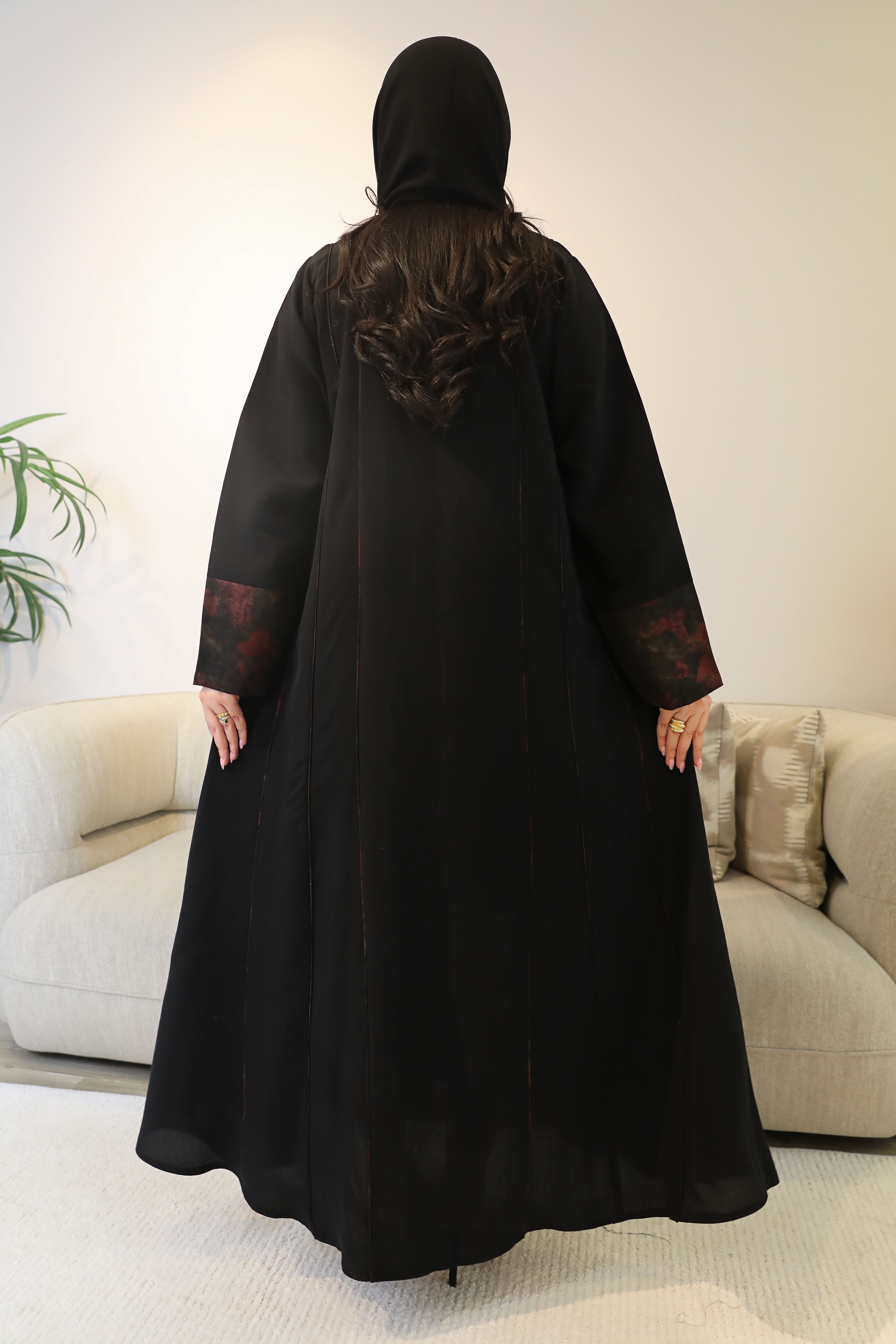 عباية شيفون بلون اسود بتدخيلة على الأكمام وخيوط طولية أنيقة