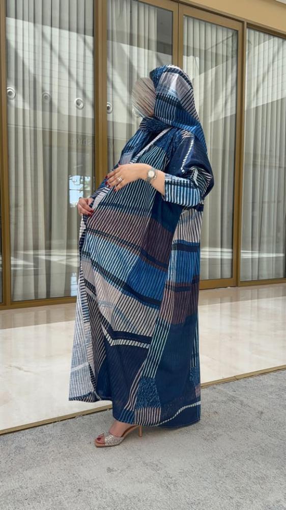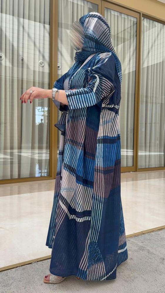 العباية تتميز بنقشات هندسية أنيقة وتداخلات لونية جذابة توزعت بذوق عالي بين التدرجات الكحلي، الأزرق السماوي، النبيتي، والبيج، تعطيك طابع عصري وفخم في آنٍ واحد.