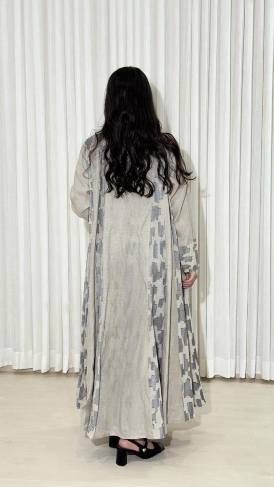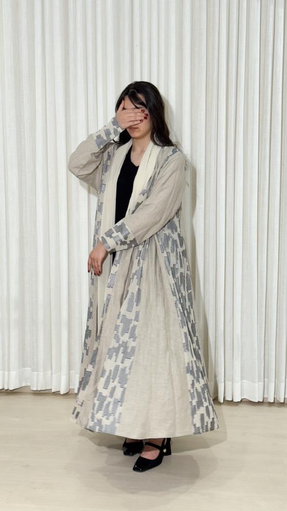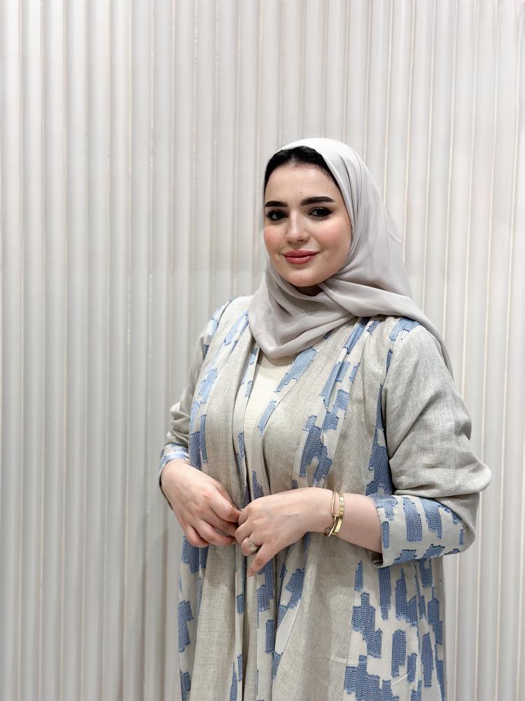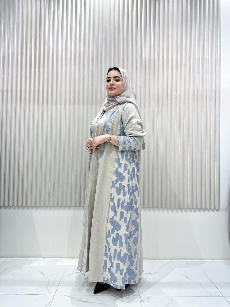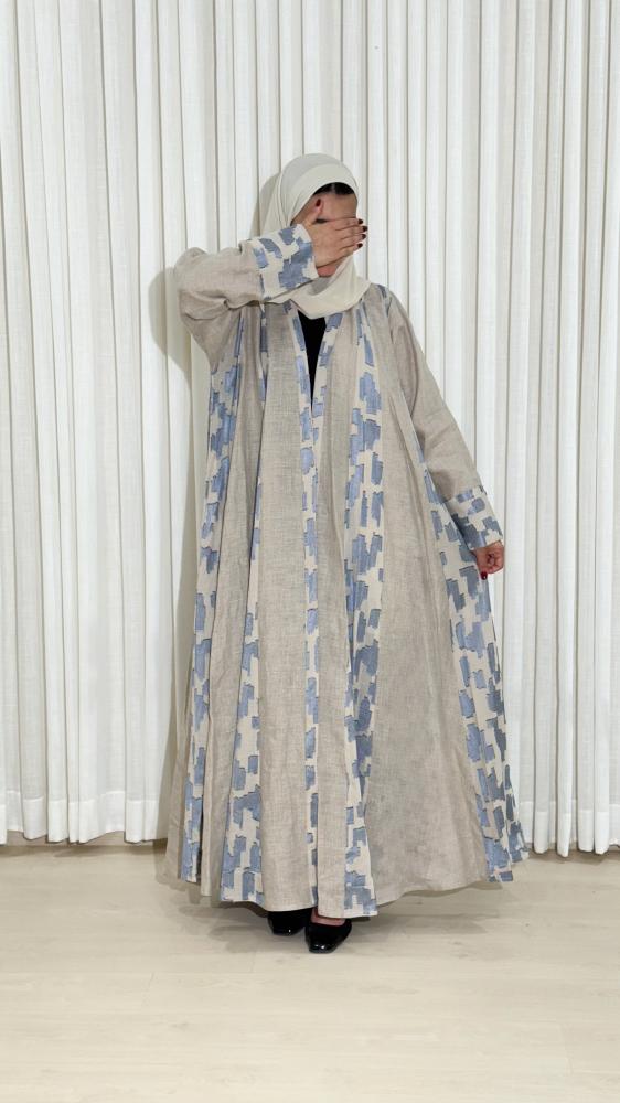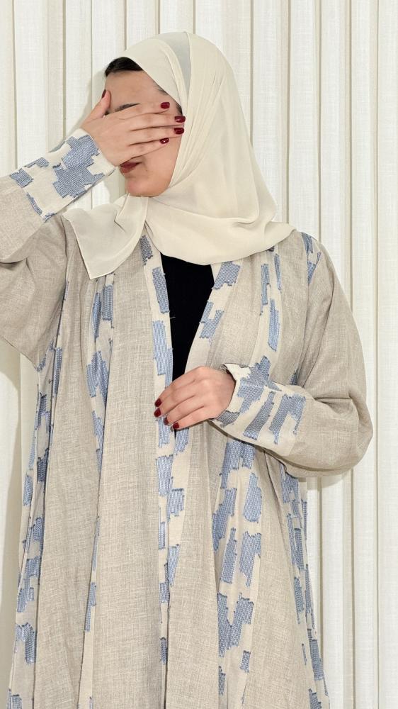 عباية لنن طبيعي بتطريز أزرق – خفّة وأناقة على أصولها العباية هذي تصرخ ستايل راقٍ ومريح بنفس الوقت! مثالية لبنات الذوق الرفيع اللي يعشقون الخامات الطبيعية واللمسات الفنية