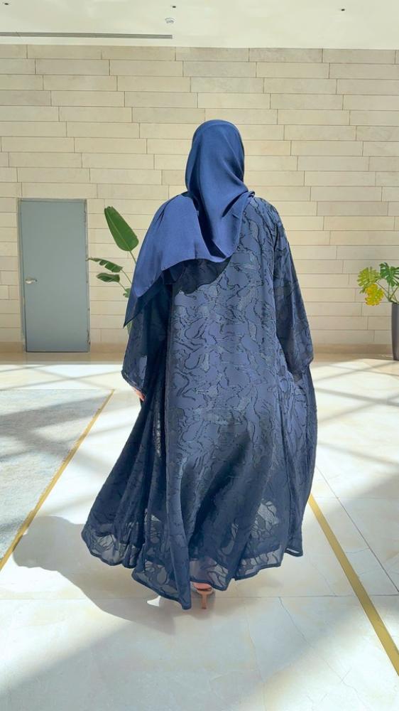 عباية سهرة أنيقة من قماش الشيفون اللامع بلون كحلي جذاب يعكس الرقي والأنوثة في كل تفصيلة.