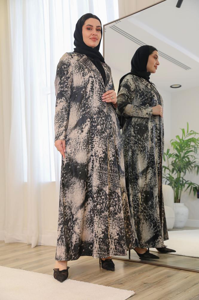 تميّزي بإطلالة جريئة وفاخرة مع عباية بليزر من قماش حرير تركي بطبعة تايقر مميزة، تجمع بين الأناقة والفخامة في تصميم واحد.