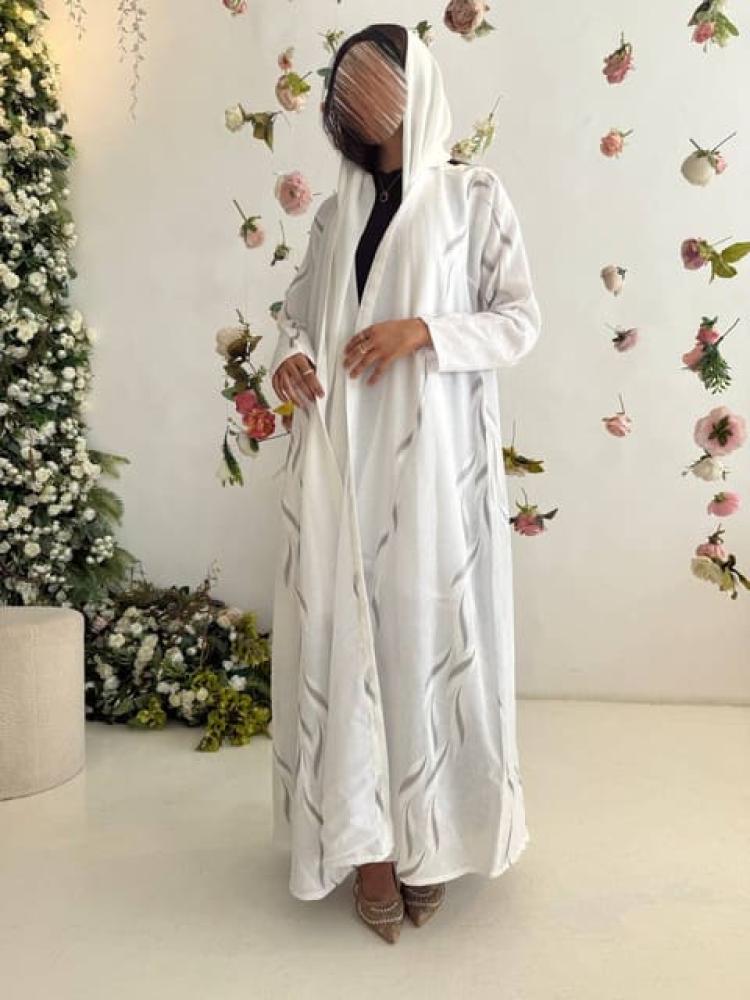 تأتي العباية مع طرحة متناسقة باللون الأبيض لتكمل الإطلالة بأناقة متكاملة، مما يجعلها قطعة مثالية للمرأة التي تبحث عن مزيج من الرقي والراحة في الوقت نفسه. تصميم العباية العصري يبرز جمال الرسومات الزخرفية ويضفي لمسة أنثوية راقية
