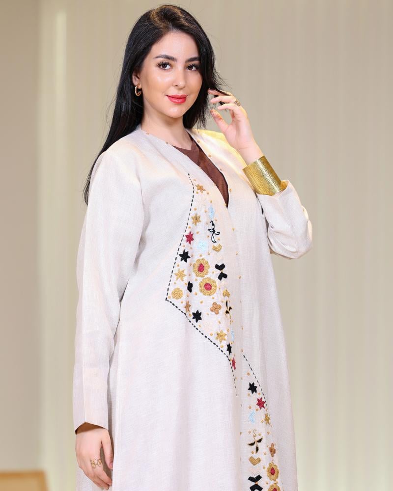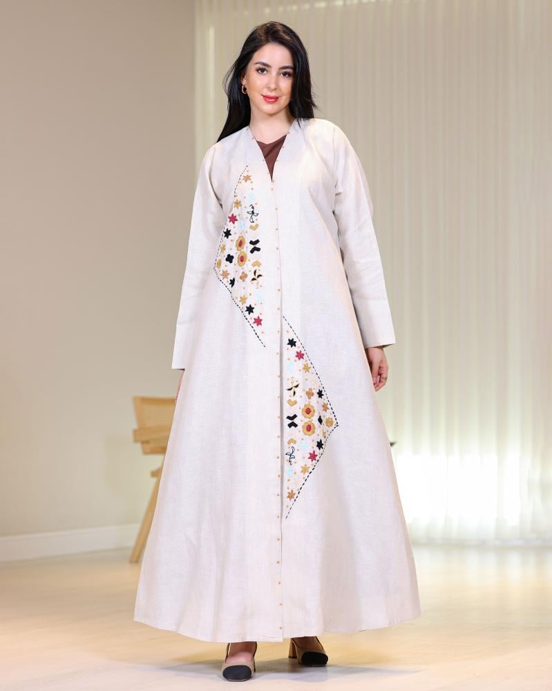 تميّزي بإطلالة أنيقة وطبيعية مع هذه العباية المصنوعة من قماش اللِّن الطبيعي الهندي الفاخر، المعروف بملمسه الناعم وخفّته المناسبة للأجواء الحارة.