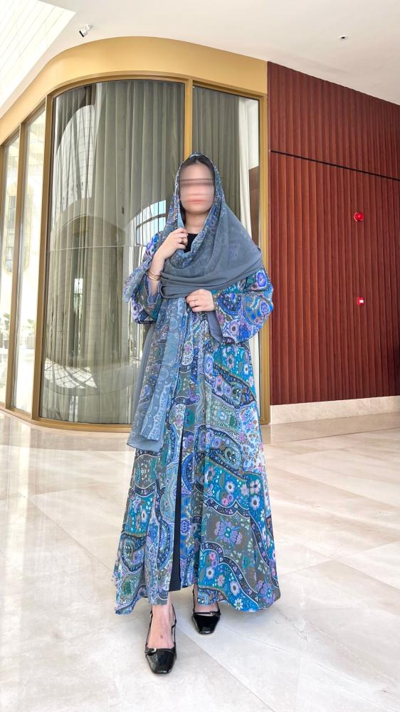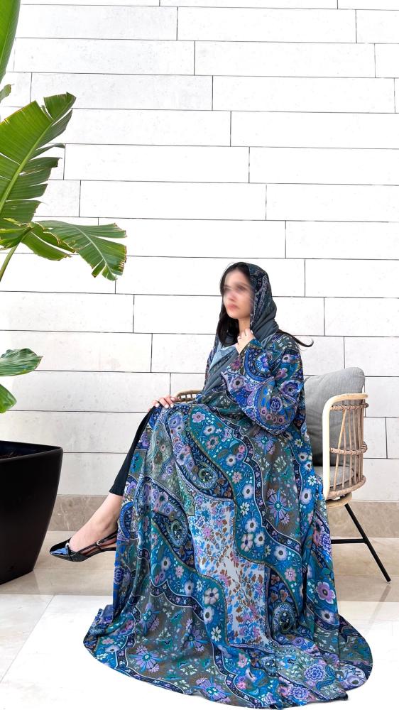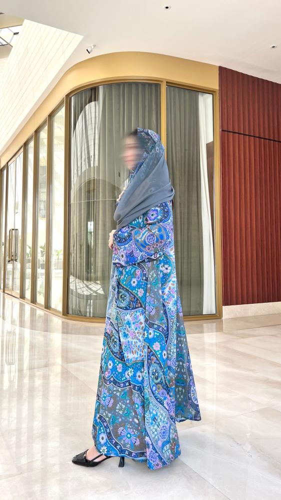 قماشها منسدل بخفّة ولمعة ناعمة تعطي إحساس أنيق وراقي، واللون الأساسي يجمع بين تدرجات الأزرق، الأخضر، والرمادي مع نقوش ورود وزخارف بايسلي موزّعة بشكل فنّي يخطف الأنظار.